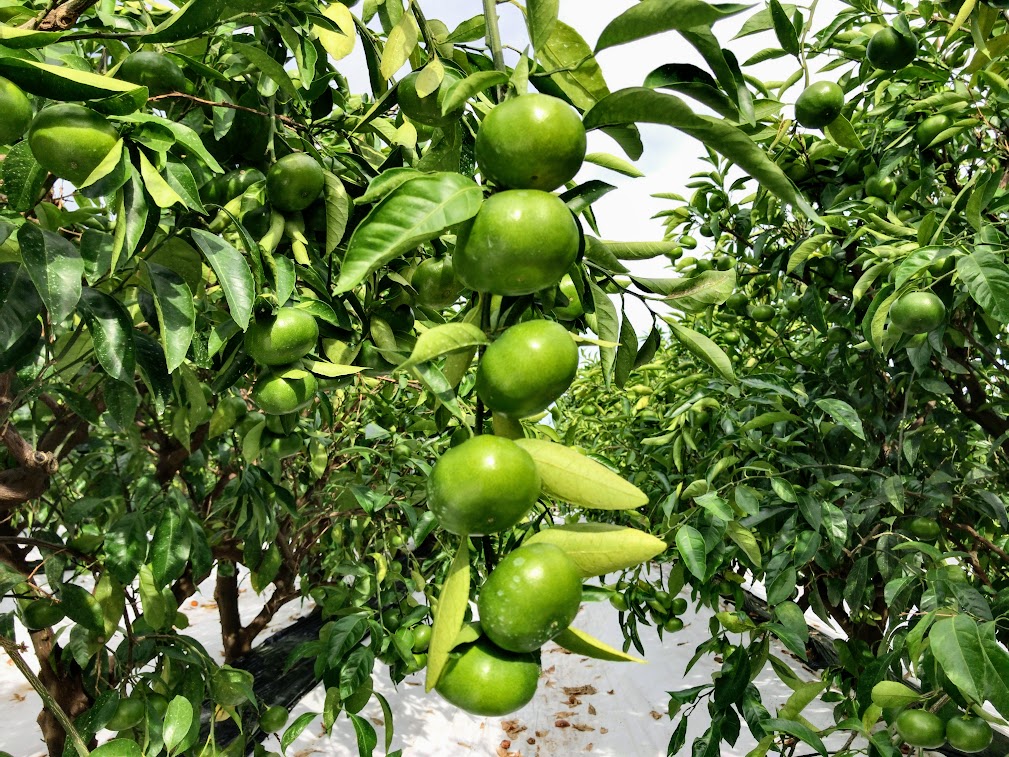 幼果時期は空に向かって成っていたのが重みで枝が徐々に下がってきました。柑橘はこうして枝がたわむことにより美味しくなると言われています。養分を送るパイプが圧迫されて生長養分がうんぬんかんぬん…だったかと…え~…思います。