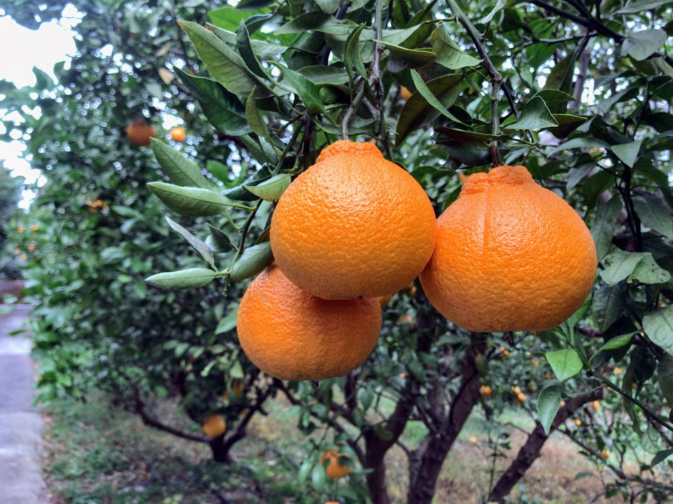 「デコポン」の名前でおなじみの「不知火」です。「デコポン」はJAに出荷された不知火の中で一定の基準をクリアしたものに付けられるブランド名なので、JAに出荷していない当園ではすべて「不知火」となります。