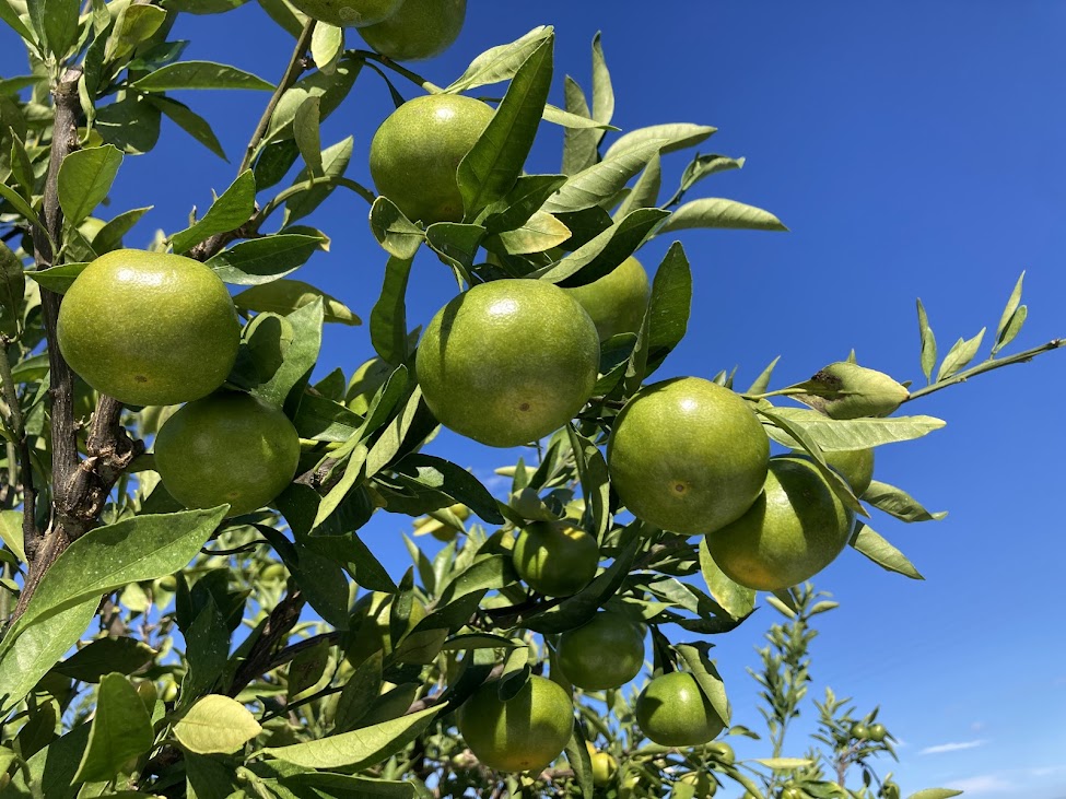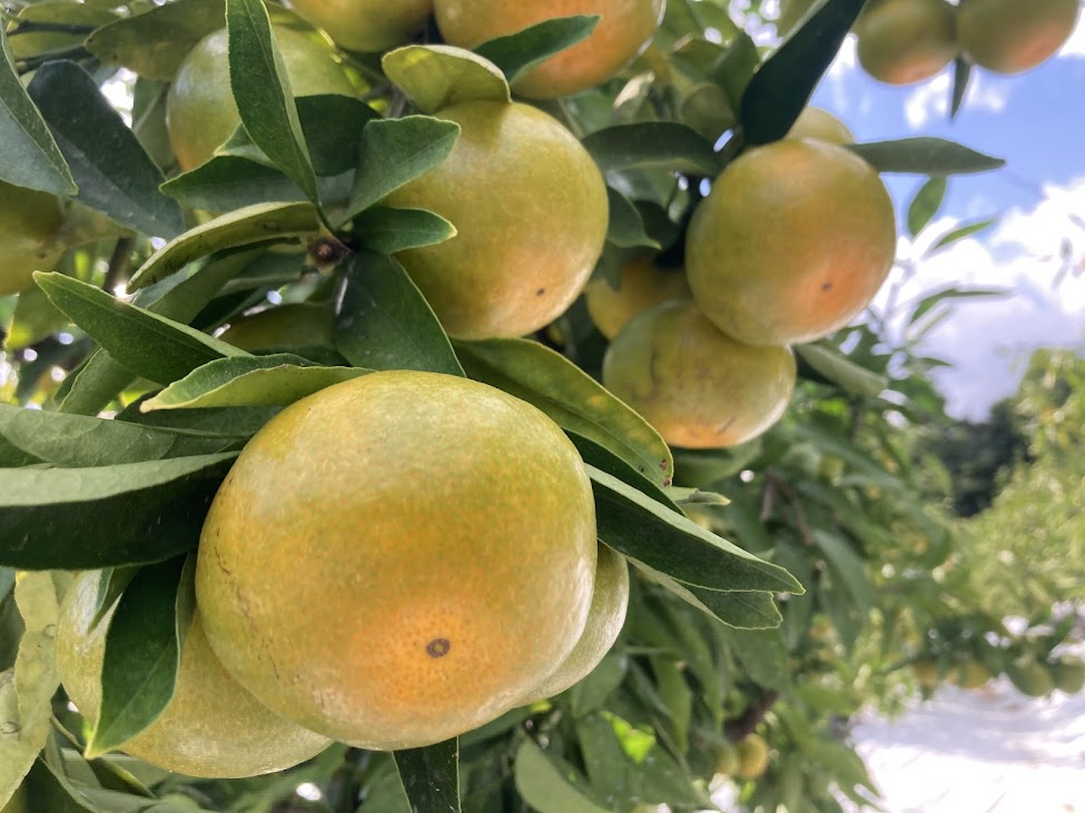 冬場にかけて成熟期を迎える「早生みかん」以降の系統については、樹全体がしっかりと色づくのを待って収穫すれば良いのですが、こと開花から成熟までの期間が短い「極早生みかん」については、着色や中身の成熟度合いに差が大きく出がちな上、気温が高いせいもあって一番美味しい期間が非常に短いのですね。そのため色づきの良いものから先に収穫することになります。