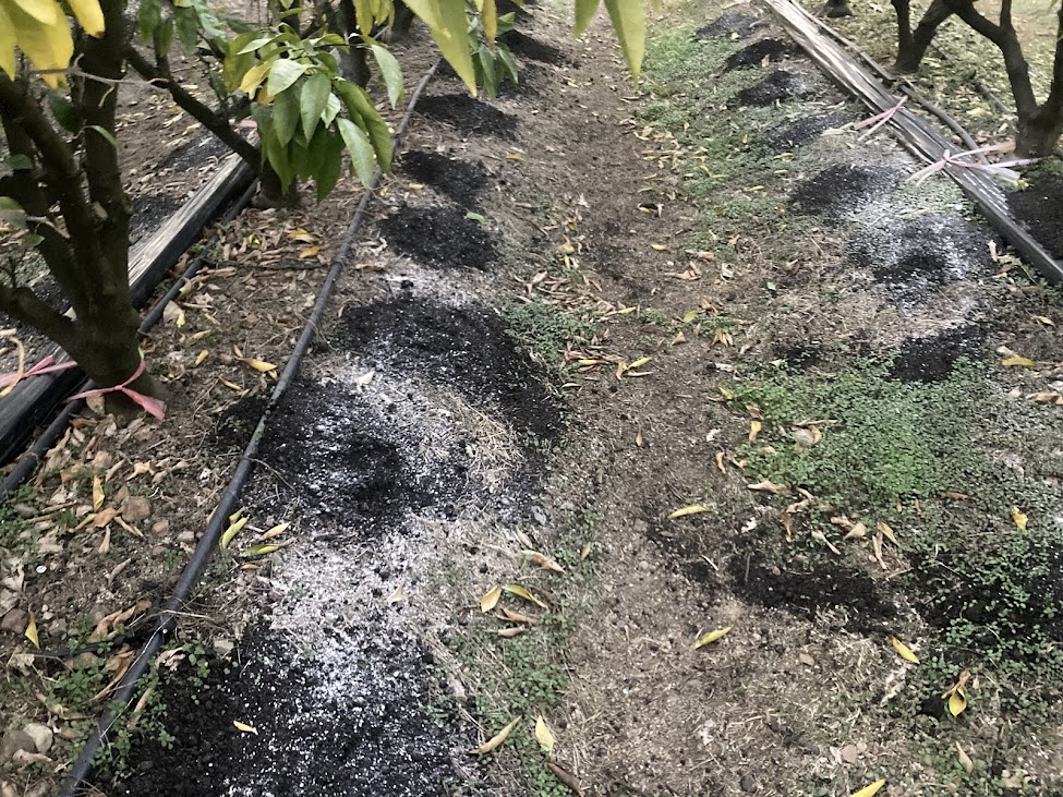 当園の土壌は柑橘の適正値である5.5~6.5にだいたい収まっているので、カルシウムの補給としてPh矯正力の弱い牡蠣の殻を粉末状にした炭酸カルシウムを1月と5月頃の2回に分けて少量づつ施用しています。