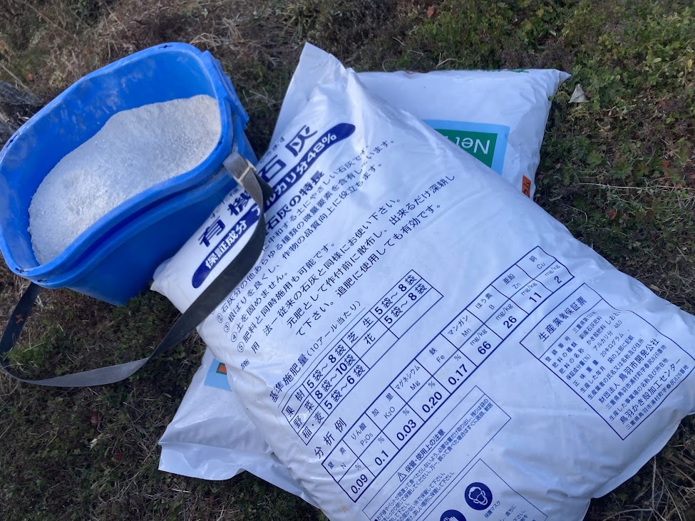 予想外の時間を取られることとなりましたが、先日からやっていた堆肥も一旦配り終わっているので、土作り第二段階の石灰撒きに入ります。