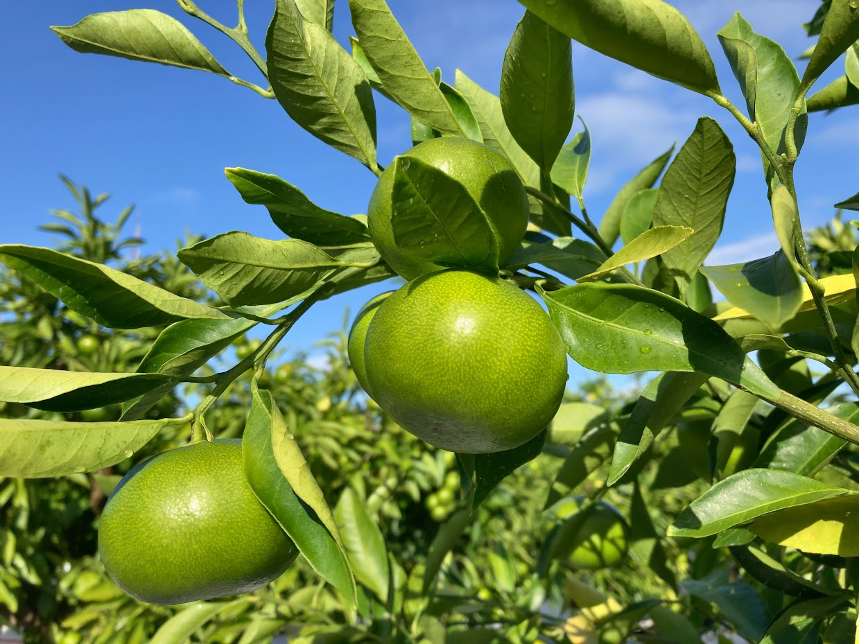 みかんには甘みと同時に酸味も大事な要素です。みかんの酸味はレモンと同じクエン酸で出来ていて、甘みが作られる前の栄養生長期はレモンのようにひたすら酸っぱい味がします。これが生殖生長期に入って成熟が進むに連れて徐々に分解されていくという仕組みになっています。